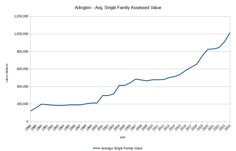 Chart showing the average assessed value of single-family homes in Arlington, MA, from 1988--2024. Data sourced from https://dlsgateway.dor.state.ma.us/reports/rdPage.aspx?rdReport=AverageSingleTaxBill.SingleFamTaxBill_wRange