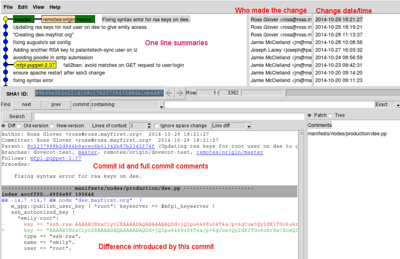 | current | 21:47, 5 November 2014 | 1,002 × 647 (124 KB) | SteveR (talk | contribs) | Screenshot of gitk, with annotations Category:Linux Class |