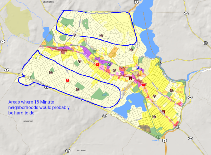 A map that (roughly) highlights areas of Arlington, Massachusetts where zoning restrictions would prohibit 15 minute neighborhoods.